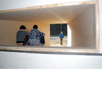 Holzbalken, Pressspanplatten, Ton. H250 / B410 / T470 cm. Zusammenarbeit mit ìle flottante. Blackbox Freiburgerstrasse 36, Basel. Die Intervention Sideseeing im ehemaligen Kiosk an der Freiburgerstrasse 36 eröffnet neue Sicht- und Hörweisen auf einen scheinbar unscheinbaren Ort an der Stadtgrenze Basels. Indem zwei Gebäudeöffnungen durch einen Holzkörper miteinander verbunden werden, wird der Durchblick auf die jeweils andere Seite ermöglicht. Es entsteht ein neuer, begehbarer Raum, der nicht nur visuell, sondern auch akustisch die unterschiedlichen Seiten dieser heterogenen Umgebung miteinander verbindet. Spaziergänger, Kunstinteressierte, Asylsuchende, Joggerinnen, Fernfahrer und auch Sie sind eingeladen, durch das Gebäude hindurch und in den Ort hinein zu schauen und zu hören.